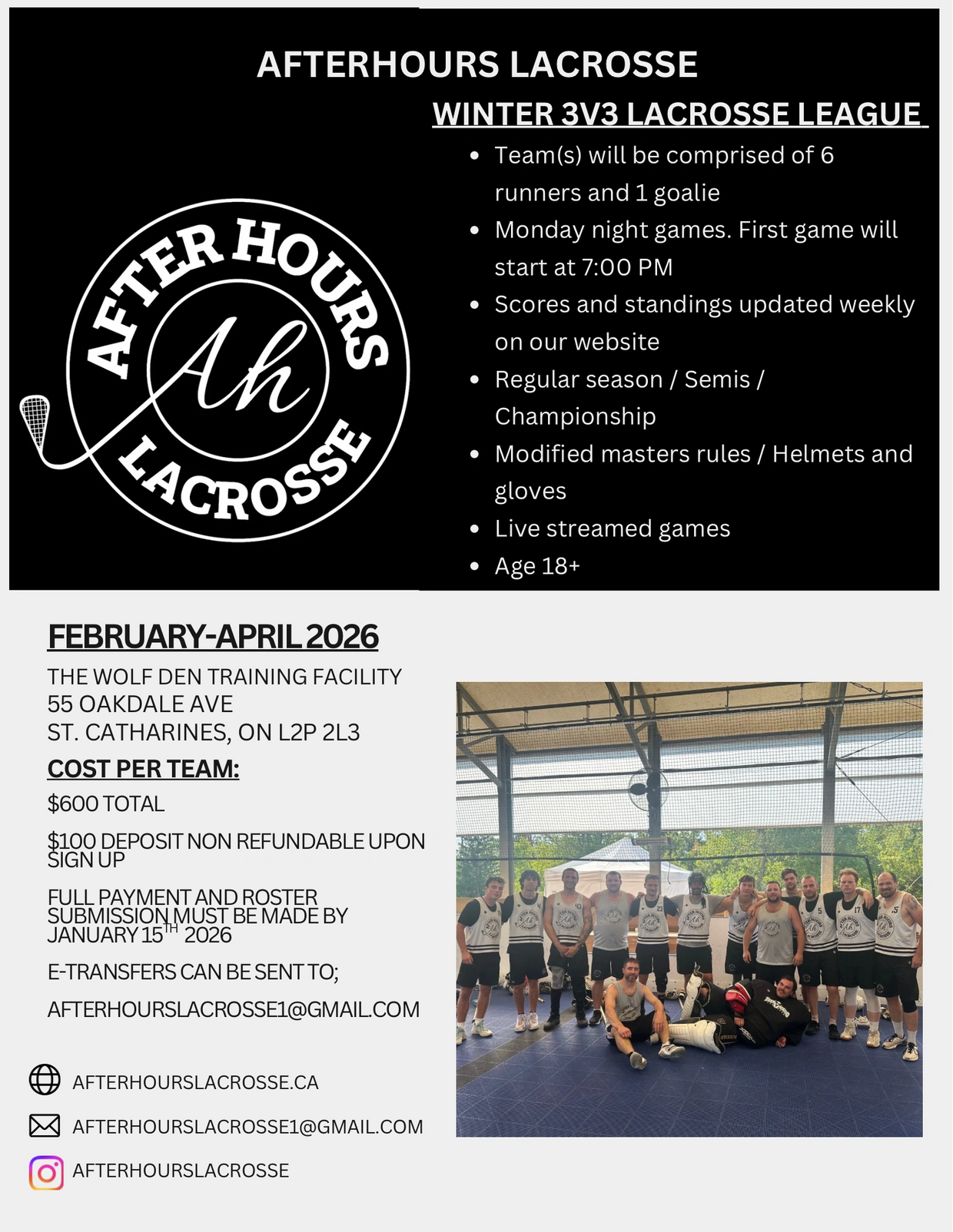 Welcome to our 3v3 Winter Masters Lacrosse League — a program built on passion, community, and the people who have carried this sport on their backs for years. This league is more than a place to play; it’s a space created for those who still love the game but may not want the intensity of full-contact lacrosse anymore. It’s about keeping the sticks moving, the friendships strong, and the competitive fire alive.